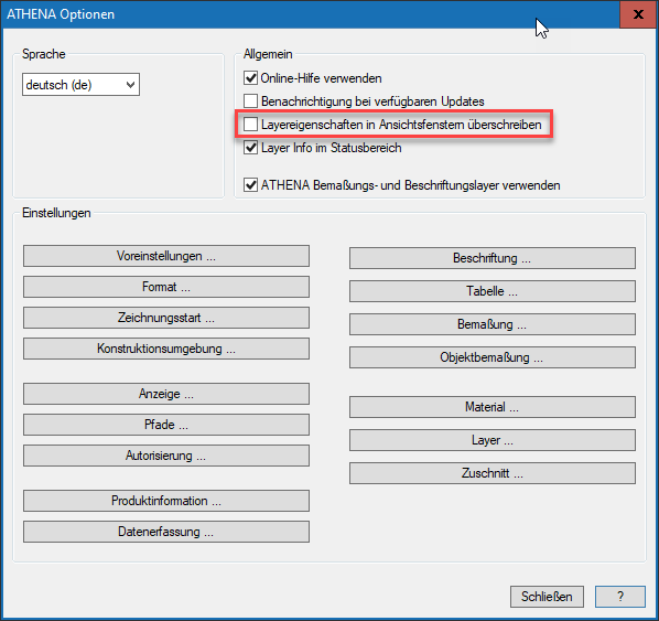 Cette fonction prend en charge l'écrasement des propriétés de calque dans les fenêtres de calques (couleur, type de ligne, épaisseur de ligne) pour les objets ATHENA. Si vous ne souhaitez pas écraser pas les propriétés des calques dans les fenêtres de présentation, vous pouvez désactiver cette fonction ici :